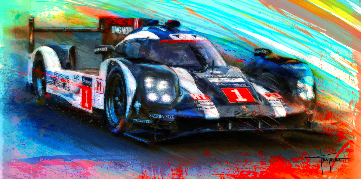 THE MIGHTY PORSCHE 919 CAME BACK TO LE MANS TO WIN THREE CONSECUTIVE VICTORIES BEFORE RETIRING ONCE AGAIN FROM THE P1 CATEGORY. PORSCHE CONTINUES TO ENJOY THE MOST VICTORIES AT LE MANS. 24X48" on museum quality canvas limited to 300 prints, hand signed and numbered by the artist. Shipped in a sturdy tube ready for you to stretch or frame as per your preference.