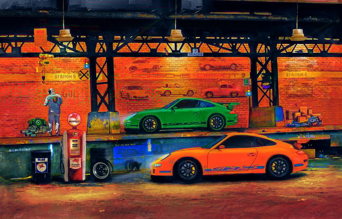 Porsche depot, the candy store for Porsche crazy people. Get your new car shipped, maybe some suspension parts or a race motor. Put in your order and it's shipped to you pronto. 24"x36" limited edition prints to 300 on museum quality canvas. Hand signed and numbered by the artist.