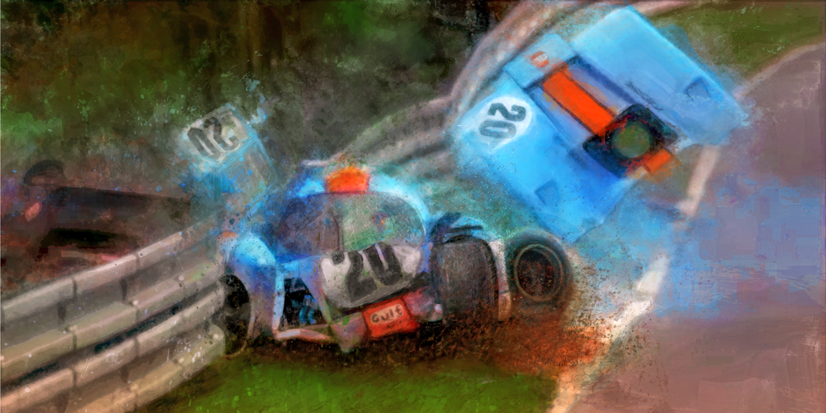 The infamous number 20 Gulf Porsche driven by the fictional character Michael Delany, played by Steve McQueen in the 1970 Movie Le Mans. Seen here is when Delany took his eyes off the road for a split second resulting in the total demolition of his Porsche as it careened off guardrails. 24"x 47" on museum quality canvas, limited to 300 hand signed and numbered by the artist. Shipped in a sturdy tube.