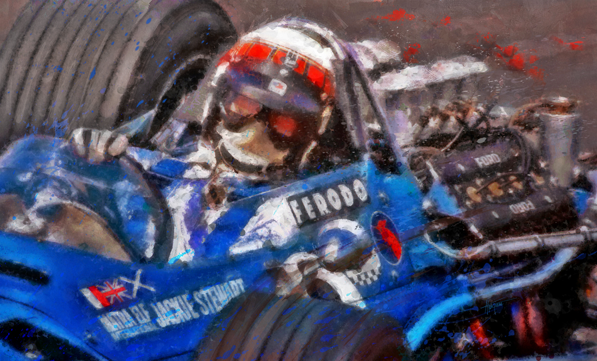 Jackie Stewart, the "wee Scott" driving his Tyrrell Ford powered Mantra. 24"x39" 300 limited edition giclee prints on museum quality canvas.