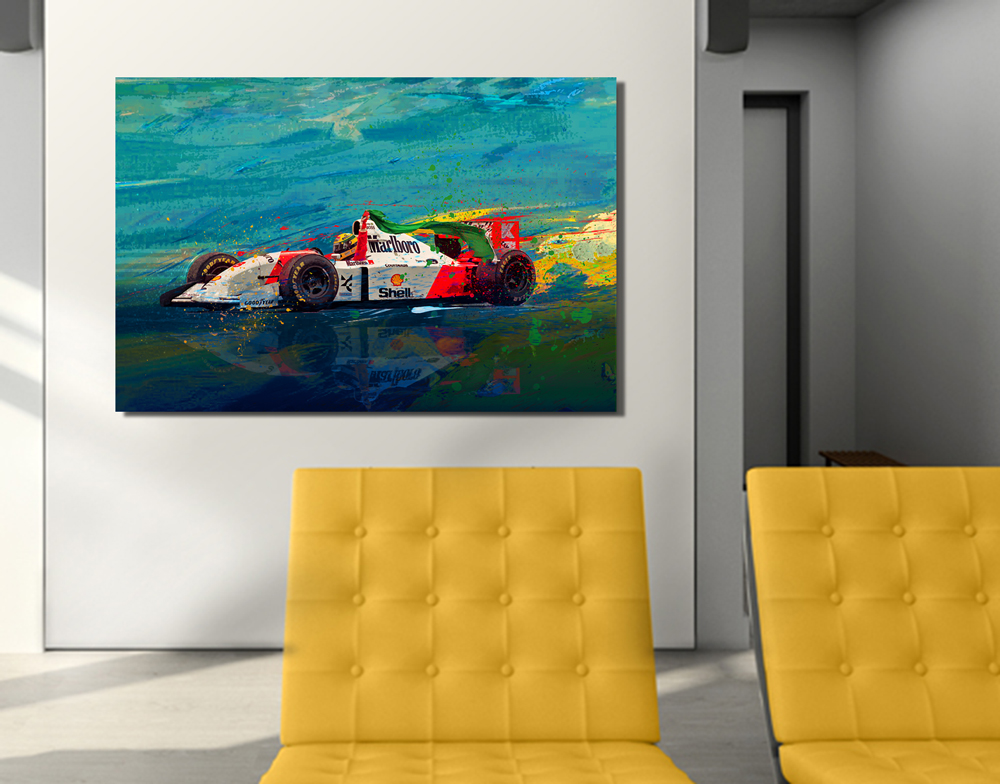 Ayrton Sena, the greatest Formula One driver in minds of many. Sena is seen here winning a world championship while proudly waving the his countries flag of Brazil. Museum quality giclee canvas print, Limited Edition to 300. 24x36" $329 Shipped in a sturdy shipping tube ready for you to gallery wrap, frame, mount or display as you wish.