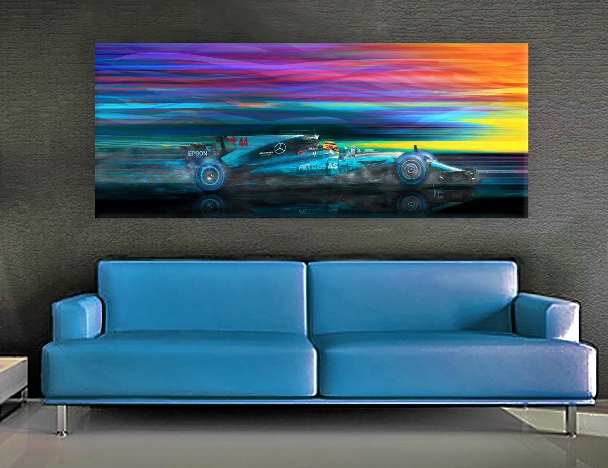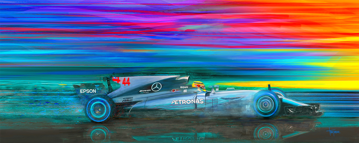 World Champion Lewis Hamilton in his 2017 Mercedes F1. A break in the weather is just what Lewis needs to change from full wets to super soft's so he just get on with it without all the slipping and sliding. 24"X60" museum quality canvas print shipped in a sturdy tube ready for stretching or framing. Limited edition to 300 prints, signed and numbered by the artist.