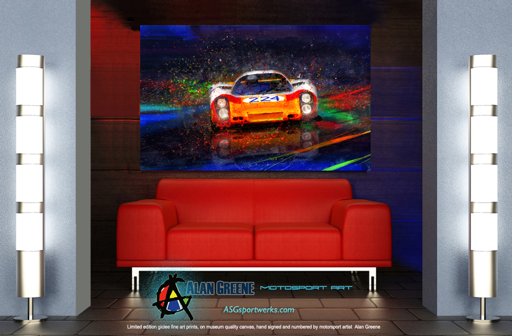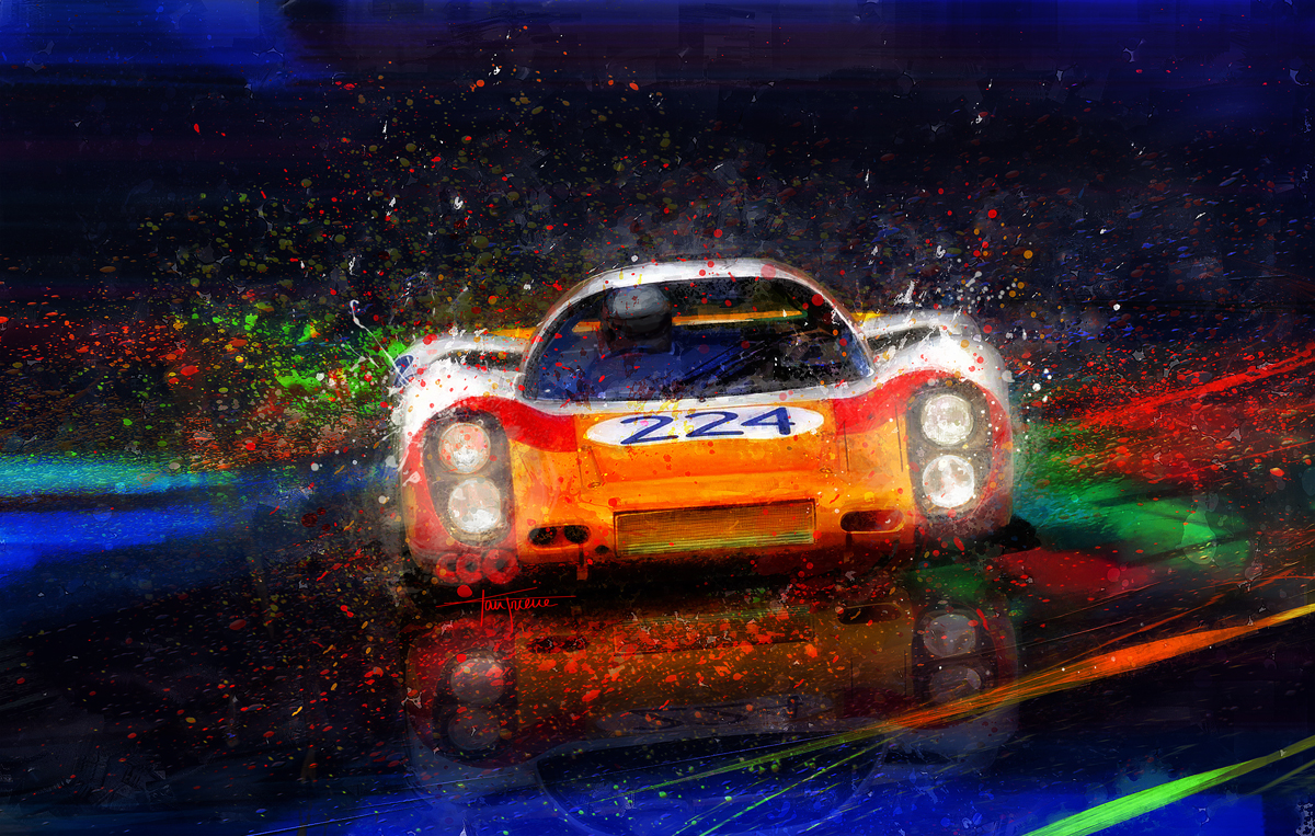 Race Legend Quick Vic Elford won the 1968 Targa Floria in epic fashion driving this Porsche 907. Vic is seen here in a "tempest" of colors.