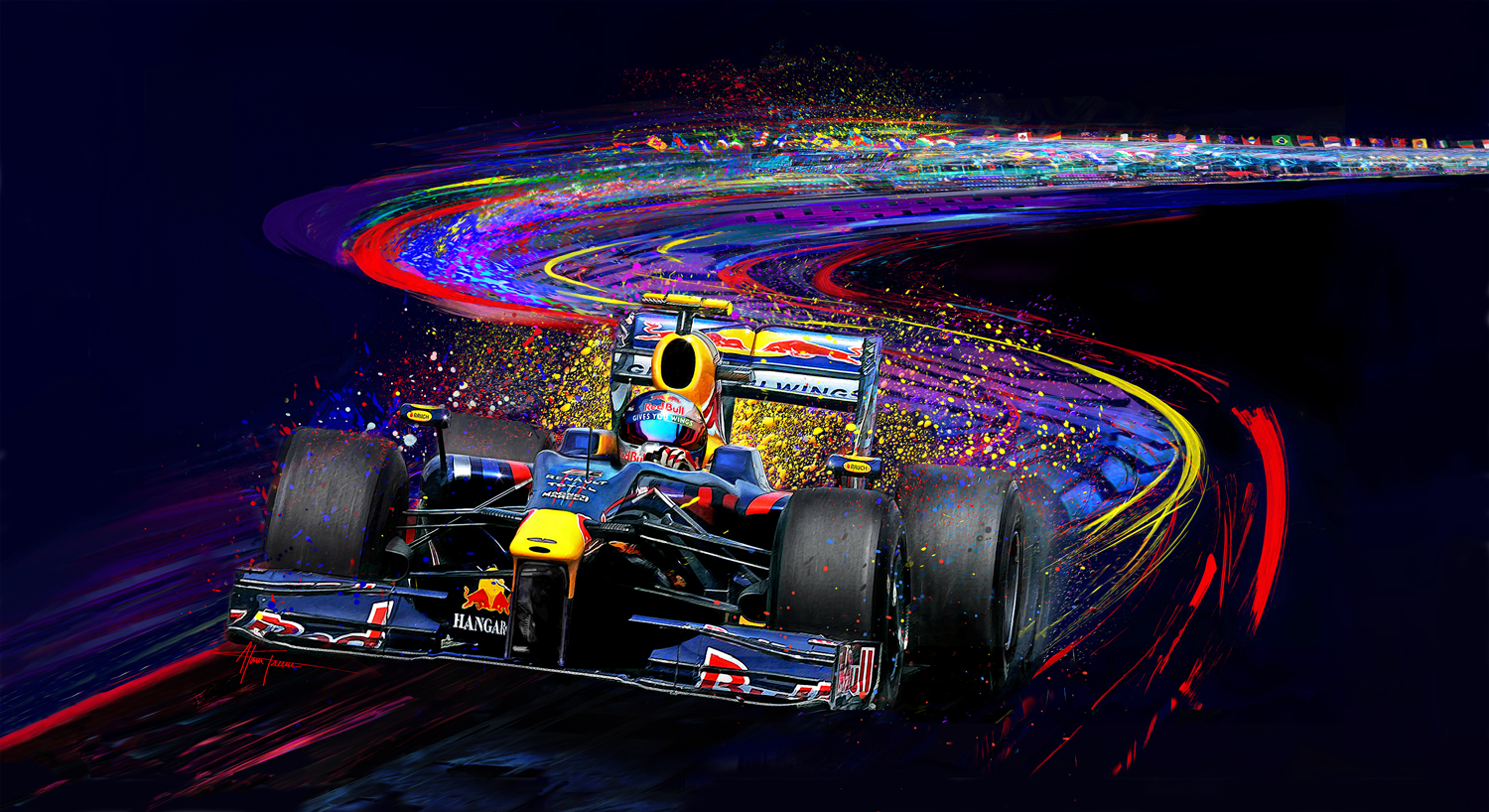 Sebastian Vettel, three time world champion with Red Bull is seen whippin the bull through the Singapore Sling under the lights on a steamy summer night. Giclee print on museum quality canvas 24"x42" Signed and numbered by the artist with certificate of authenticity. Ready for stretching or framing.