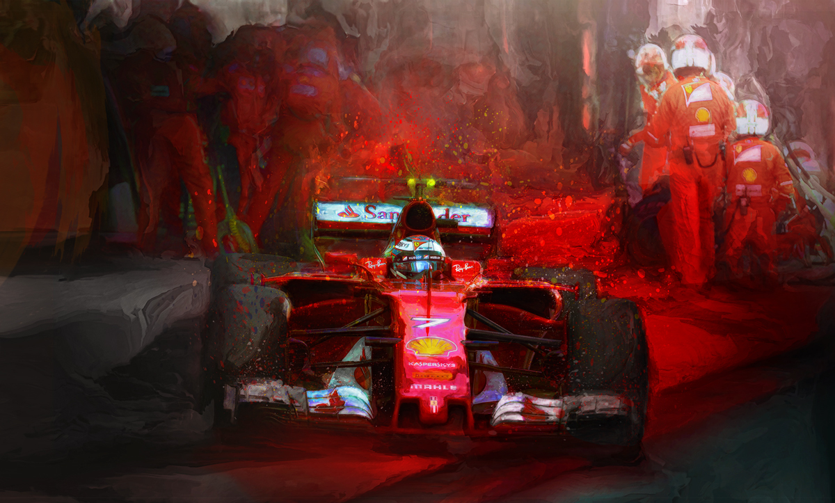 Kimi Raikkonen the venerable wiley old fox of formula one needs no direction on the radio because he knows what he's doing, 24"x 39" giclee print on museum quality canvas. Hand signed and numbered by the artist. Shipped in a sturdy tube ready to be stretched or framed as per your preference.