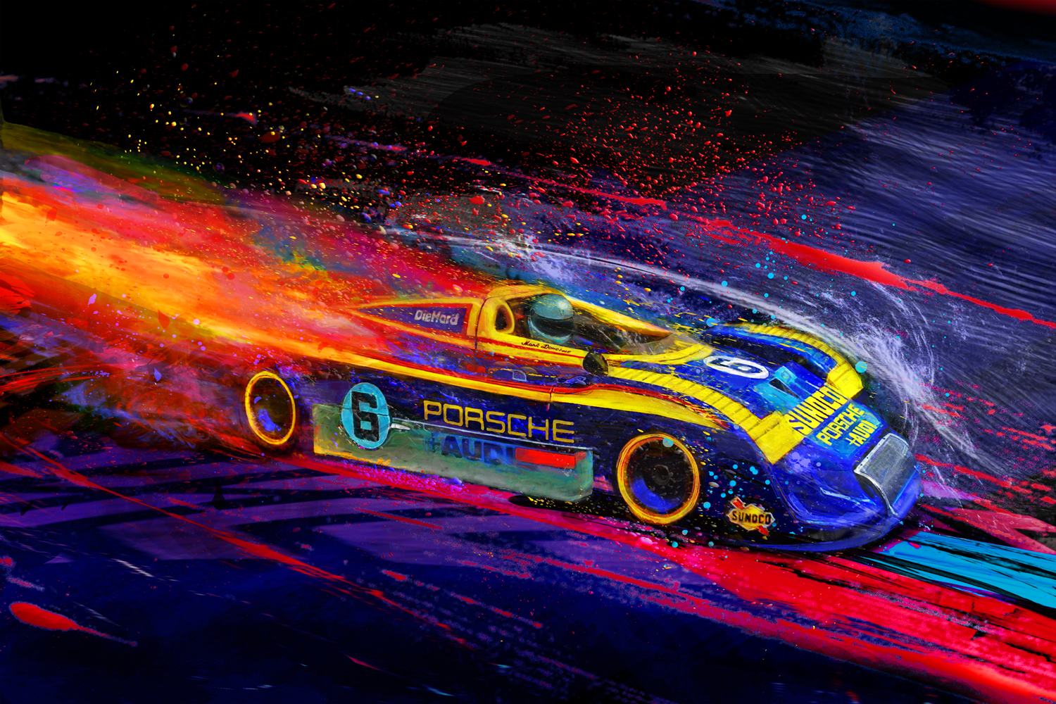 The mighty Sunoco Porsche 917 is the most powerful race car ever built. With 1200 horsepower this beast was untouchable and beat the competition like they were eggs that needed scrambling. Mark Donohue piloted this beast to many victories. 24"x36" giclee prints on museum quality canvas. Hand signed and numbered by the artist. Shipped in a sturdy tube ready for you to stretch or framed as you per your preference.
