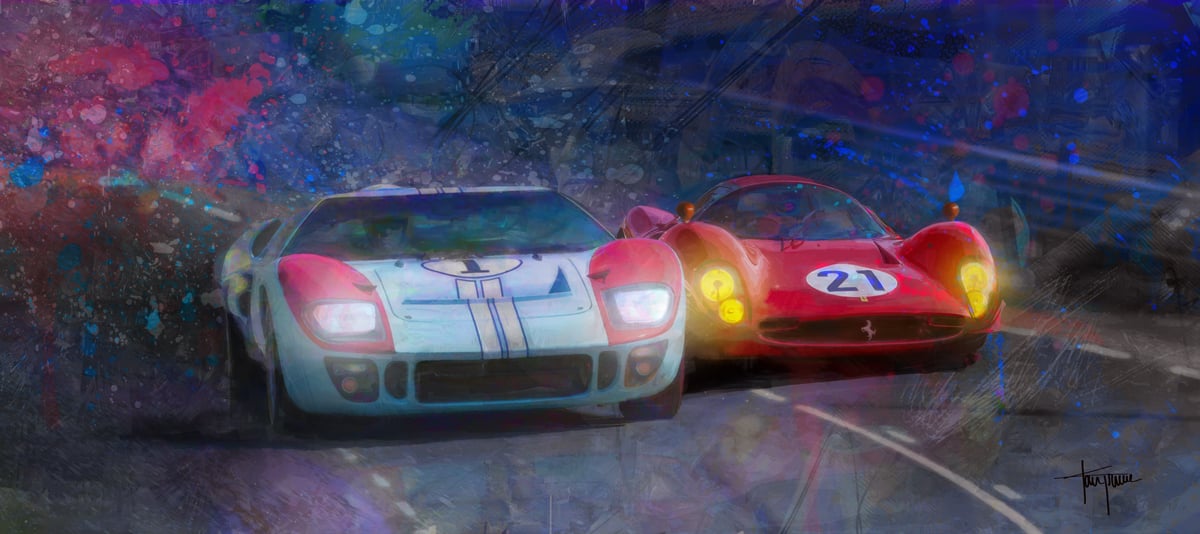 This is an abstract impression of the epic battle between Ford and Ferrari at the 24 hours of Le Mans in 1966. With Ford finally beating Ferrari at the worlds greatest auto race, finishing 1st, 2nd, and 3rd. giclee print on museum quality canvas, limited edition, hand signed and numbered to 300. Shipped in a sturdy tube ready for matting, mounting, stretching or framing. 24"x53