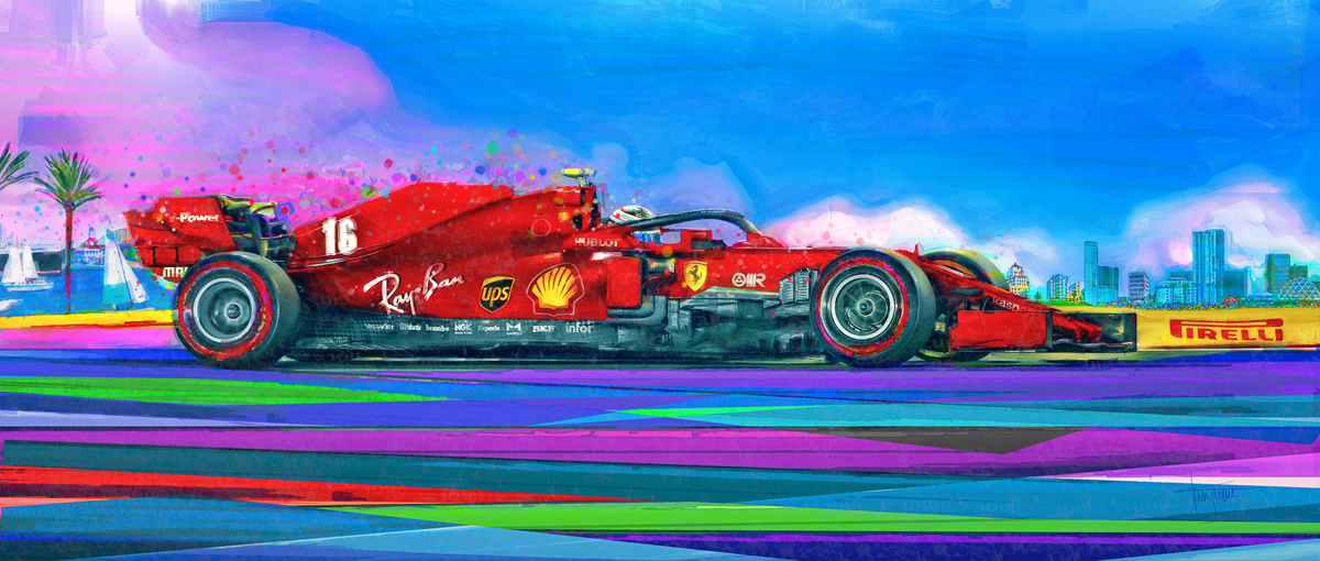 Charles LeClerc is Ferrari's young gun and has proved himself in his first two years and has become Ferrari's number one driver for 2021. He is seen here engaging party mode to wring the last bit of performance out of the wild stallion. Printed on museum quality canvas limited edition to 300. Hand signed and numbered by the artist. Shipped in a sturdy tube ready for you to frame, wrap, or mount as per your preference and taste. 24"x56"