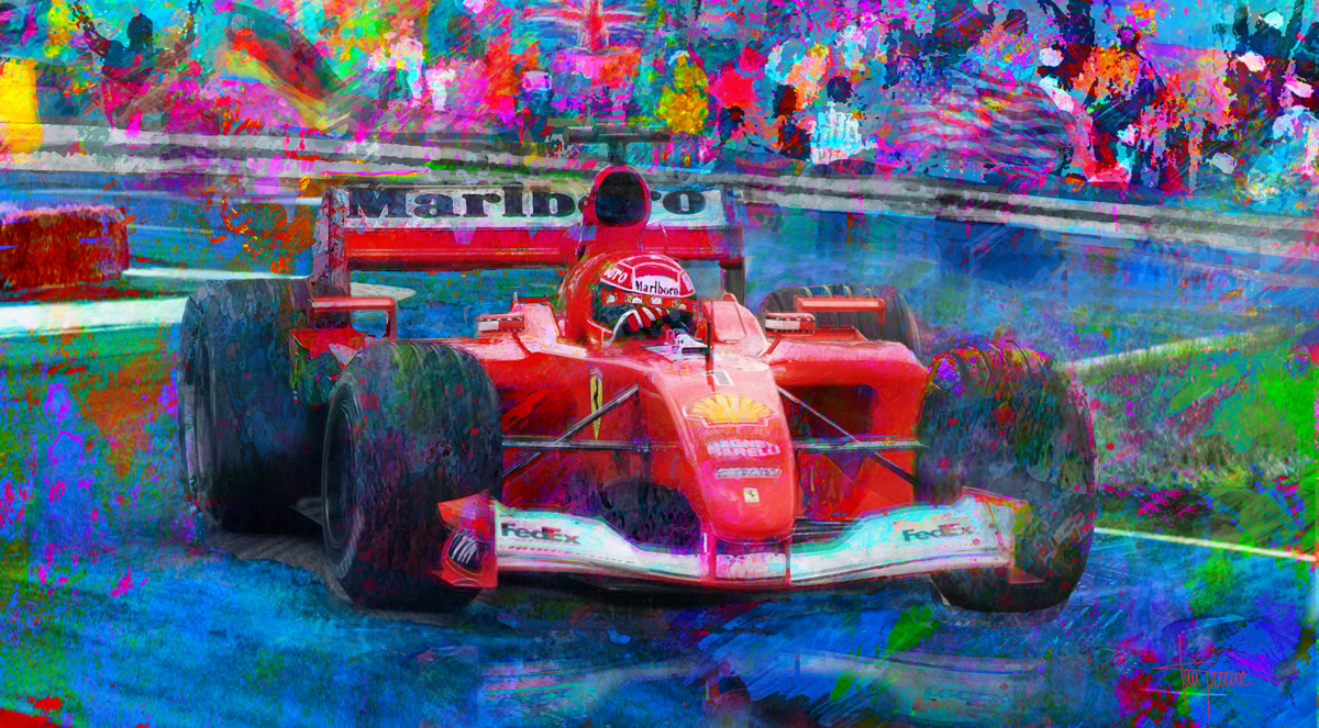 7 Time world champion, Michael Schumacher was a ruthless pilot dispatching the competition at seemingly every apex. He drove his Ferrari like it was one of his appendages. Like a comfortable shoe that just fits just right. Now wonder he won 7 world championships. Printed on museum quality canvas limited edition to 300. Hand signed and numbered by the artist. Shipped in a sturdy tube ready for you to frame, wrap, or mount as per your preference and taste.