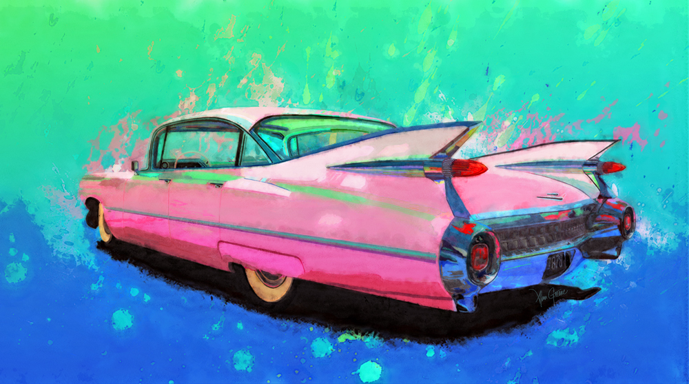 The iconic 1959 Cadillac Biarritz sporting the pink pastel of the day. The 50's color schemes of pink, seafoam green, and blues represent an age in America when everything was possible and no frontier was too far.