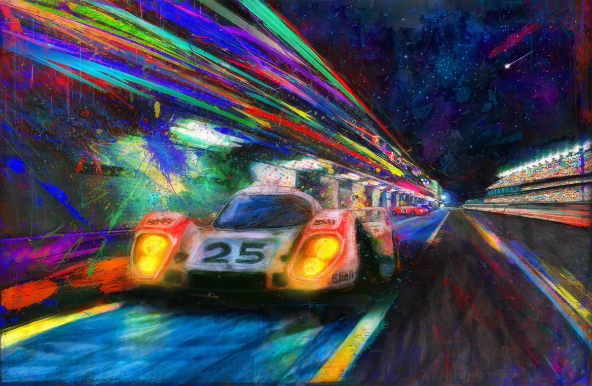 Vic "the quick" Elford who drove the number 25 Langheck at Le Mans in 1970. Vic is taking the ole Porsche 917 for reunion lap or two. A historic night for sure. 300 limited edition giclee prints hand signed and numbered by the artist. 24"x36" on museum quality canvas, shipped in a durable tube.