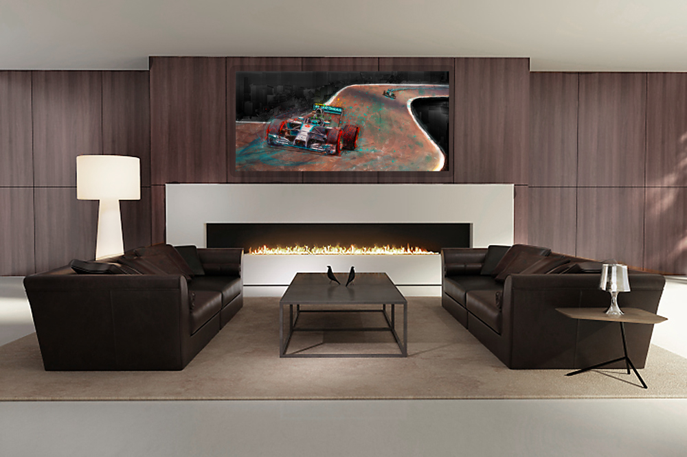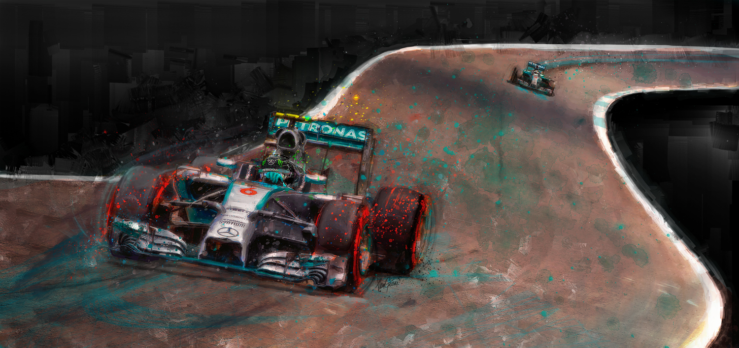 Nico Rosberg jumping out to the lead from pole position leaving the rest of the field behind with only his teammate Lewis Hamilton scrambling to catch up. The twin "Silver Arrows" are fighting it out for the 2014 World Championship. 24"X50" on museum quality canvas, limited to 300 prints hand signed and numbered by the artist.